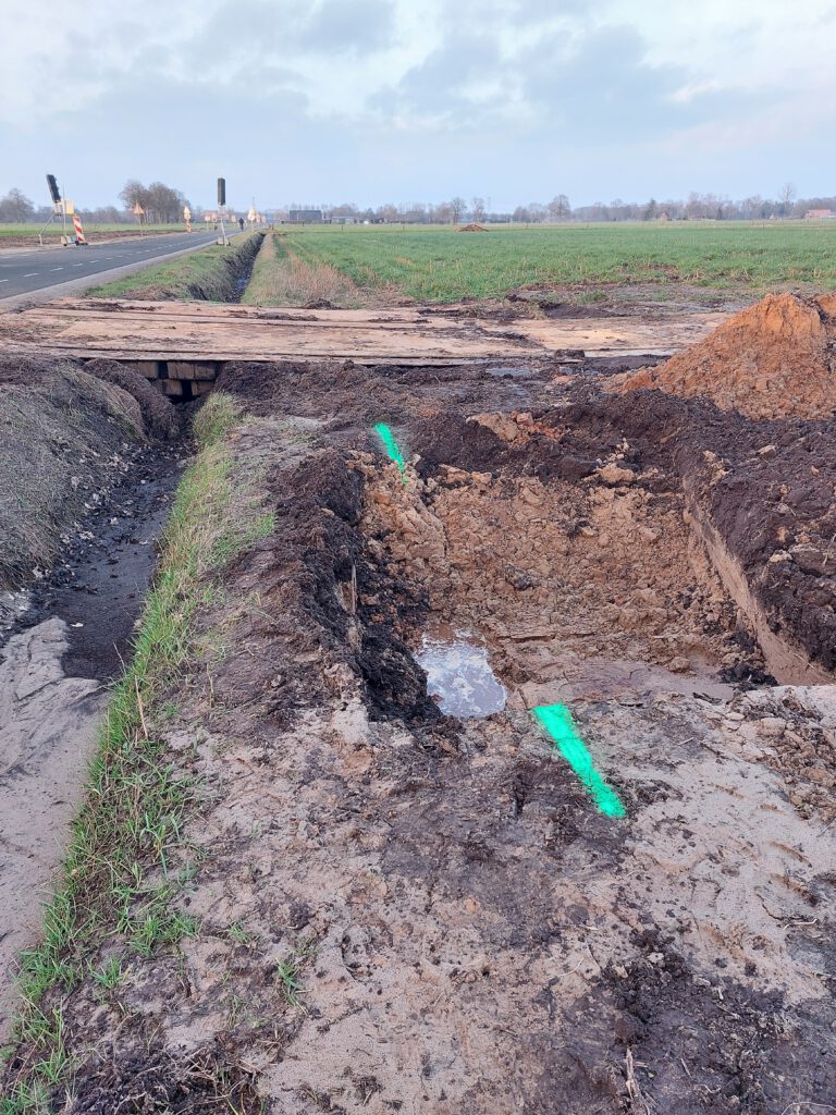 De werkzaamheden aan de waterleiding waren bij ons in november afgerond. Nu ook de rest van het traject erin zit, is de leiding met water onder druk gezet. En… helaas, ergens een lekkage. Dat is nou net bij ons, met de koppeling van de boring onder de Dalfserweg.