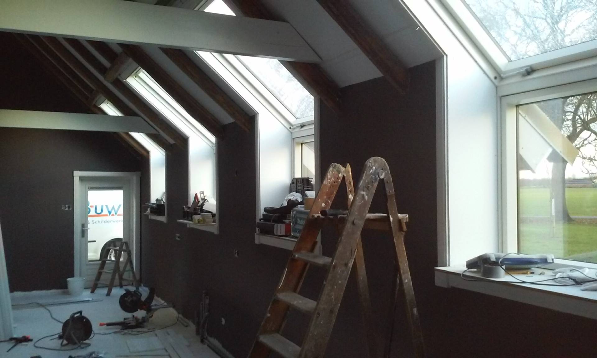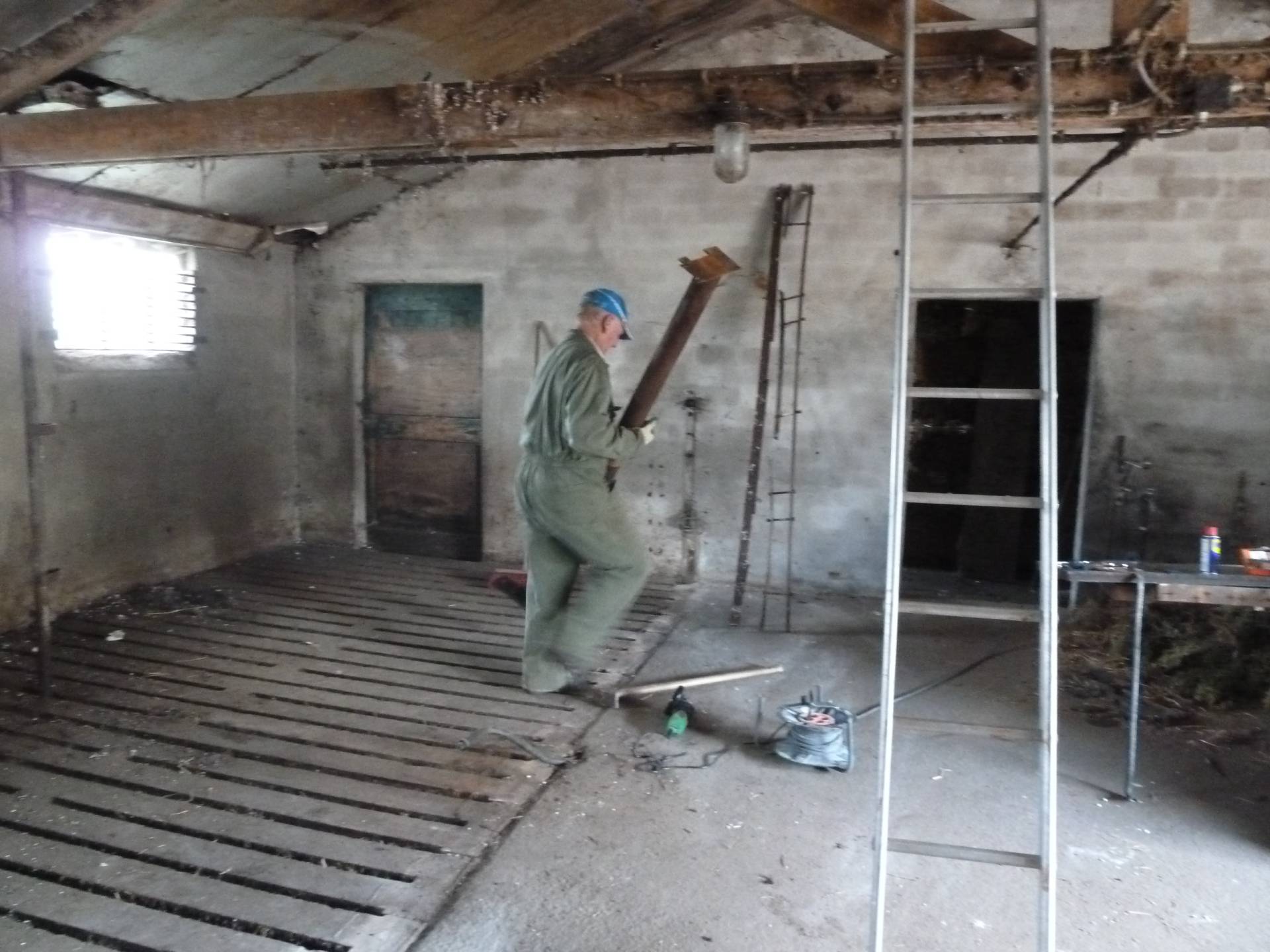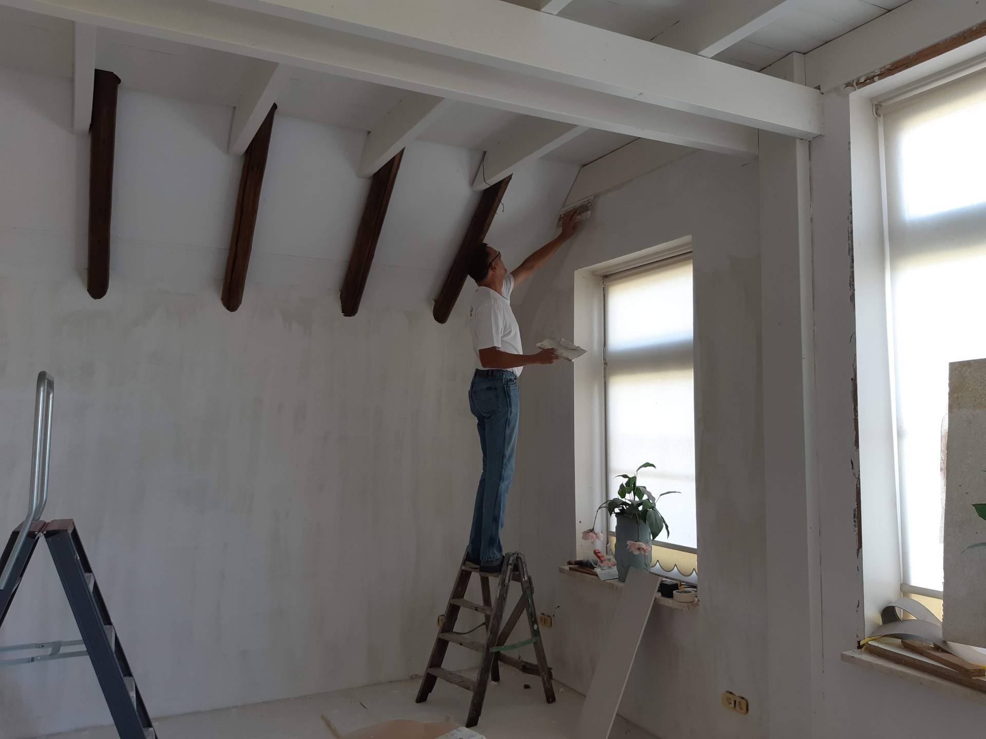 Er is een nieuwe achtergevel opgebouwd en boven de deel hebben we een verdiepingsvloer gemaakt. Hiervoor moesten de gebinten en de balken vervangen worden.