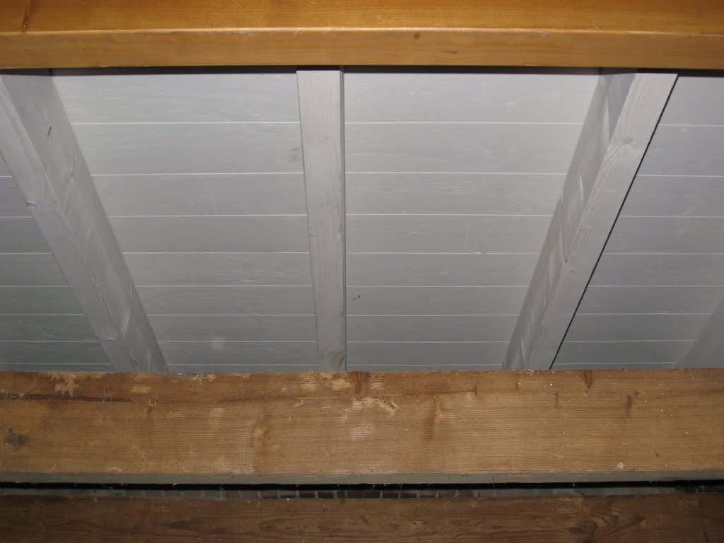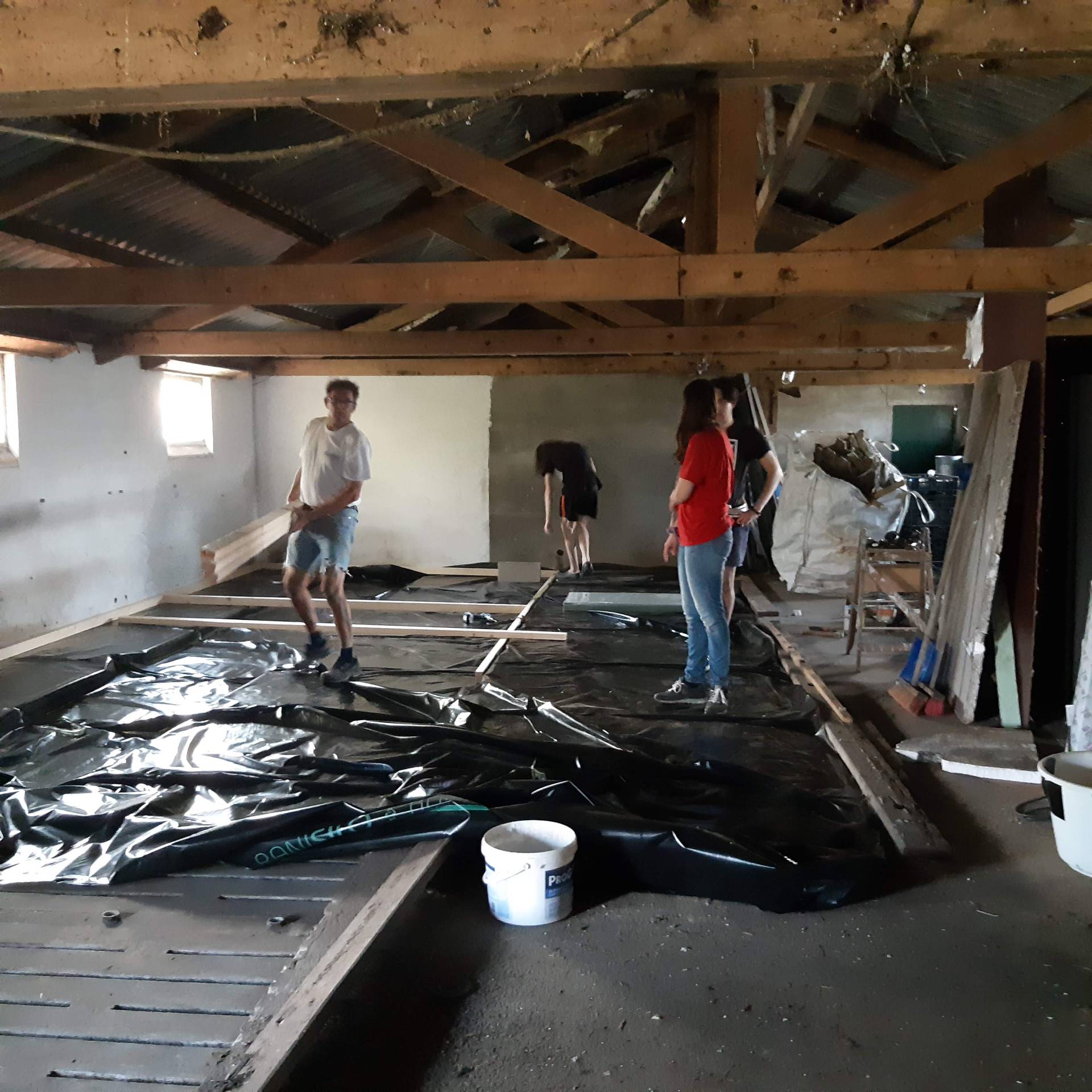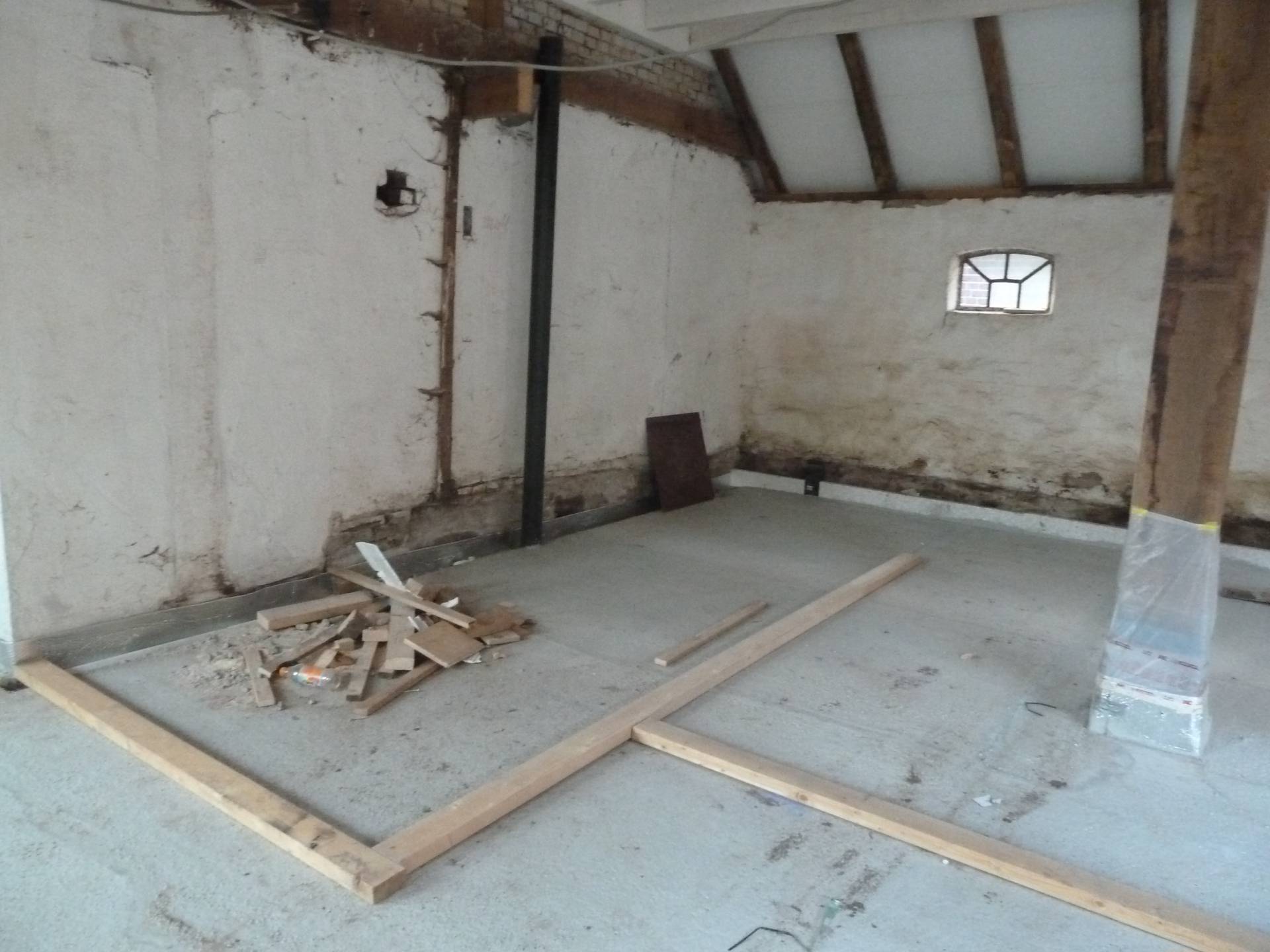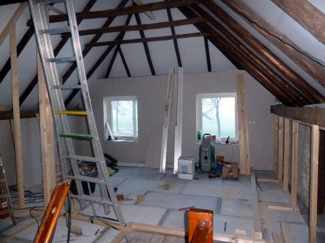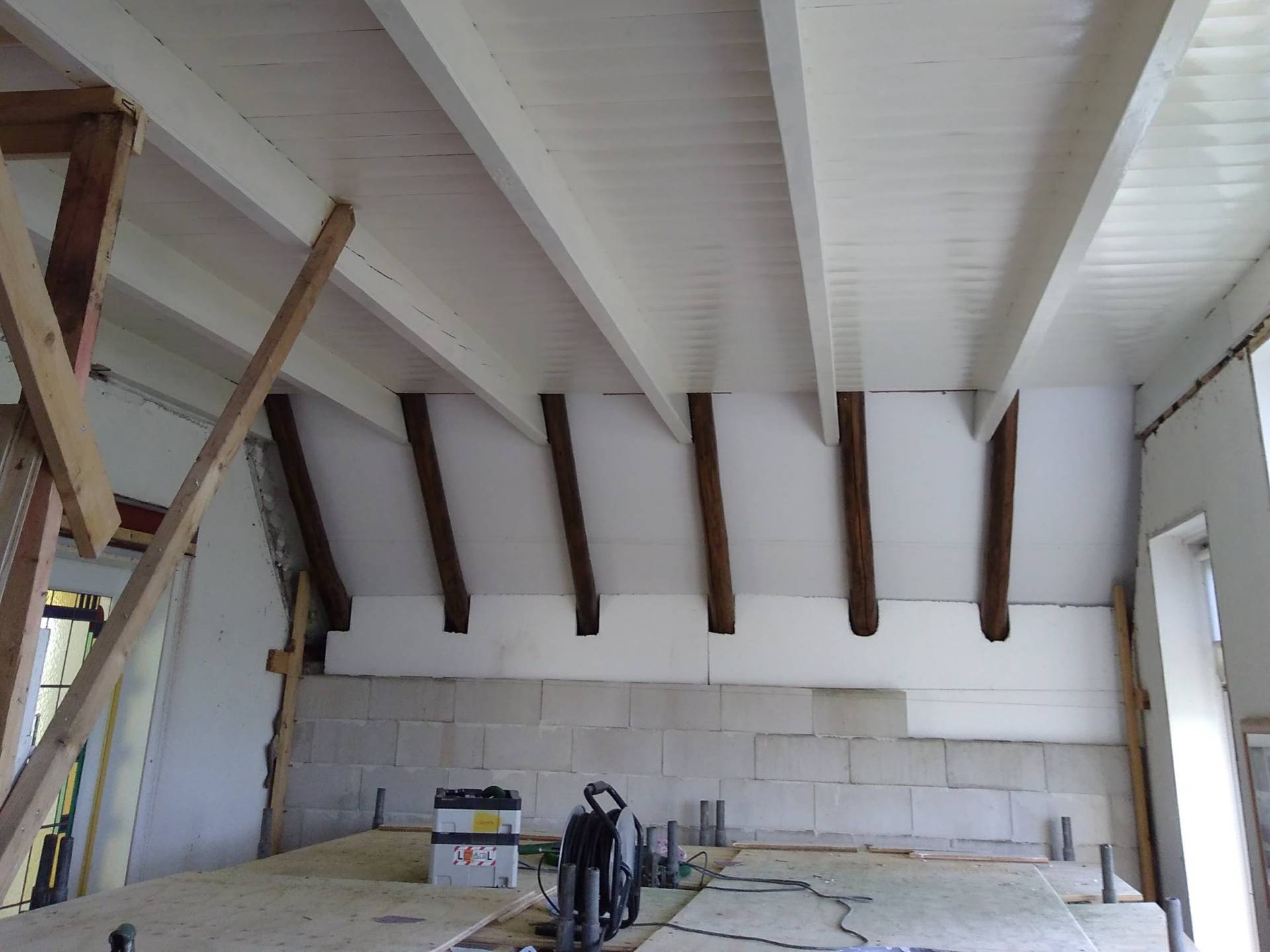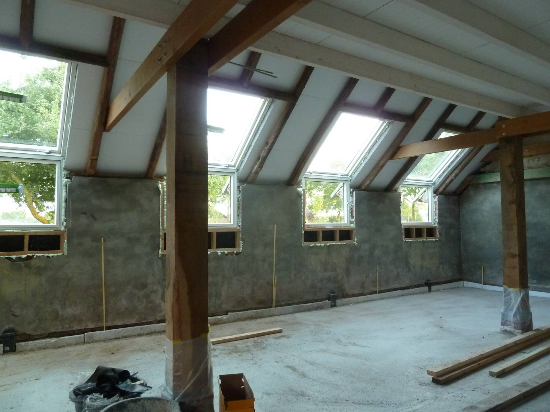 In het najaar wordt de (ook goed geïsoleerde) betonvloer gestort en maken we ook hier een nieuw binnenblad met spouw en isolatie. Het balkenplafond is helemaal opgeknapt.