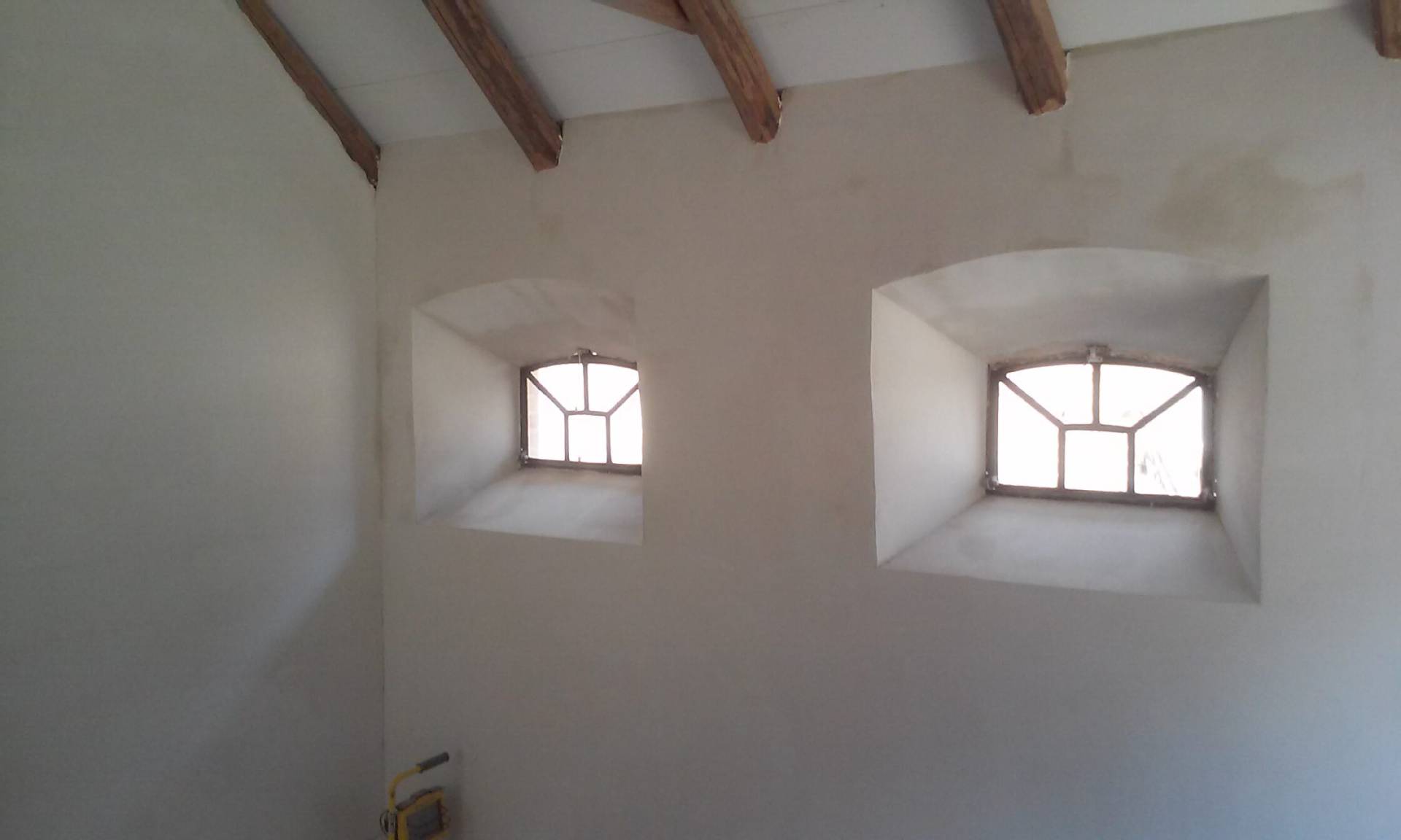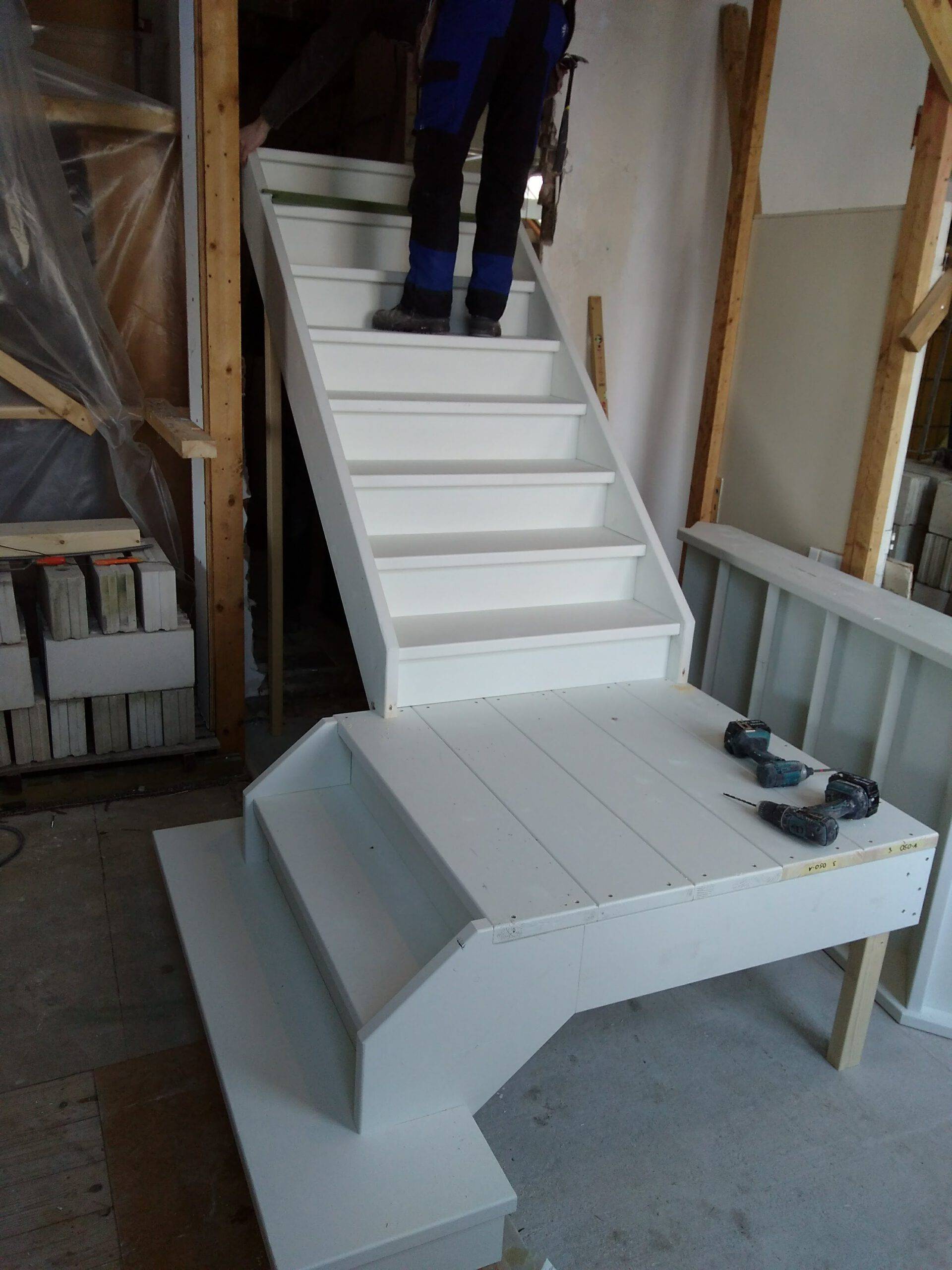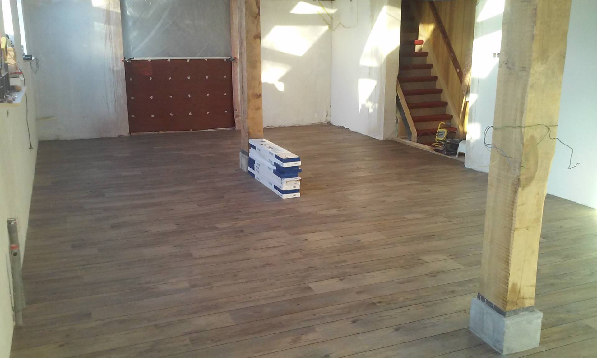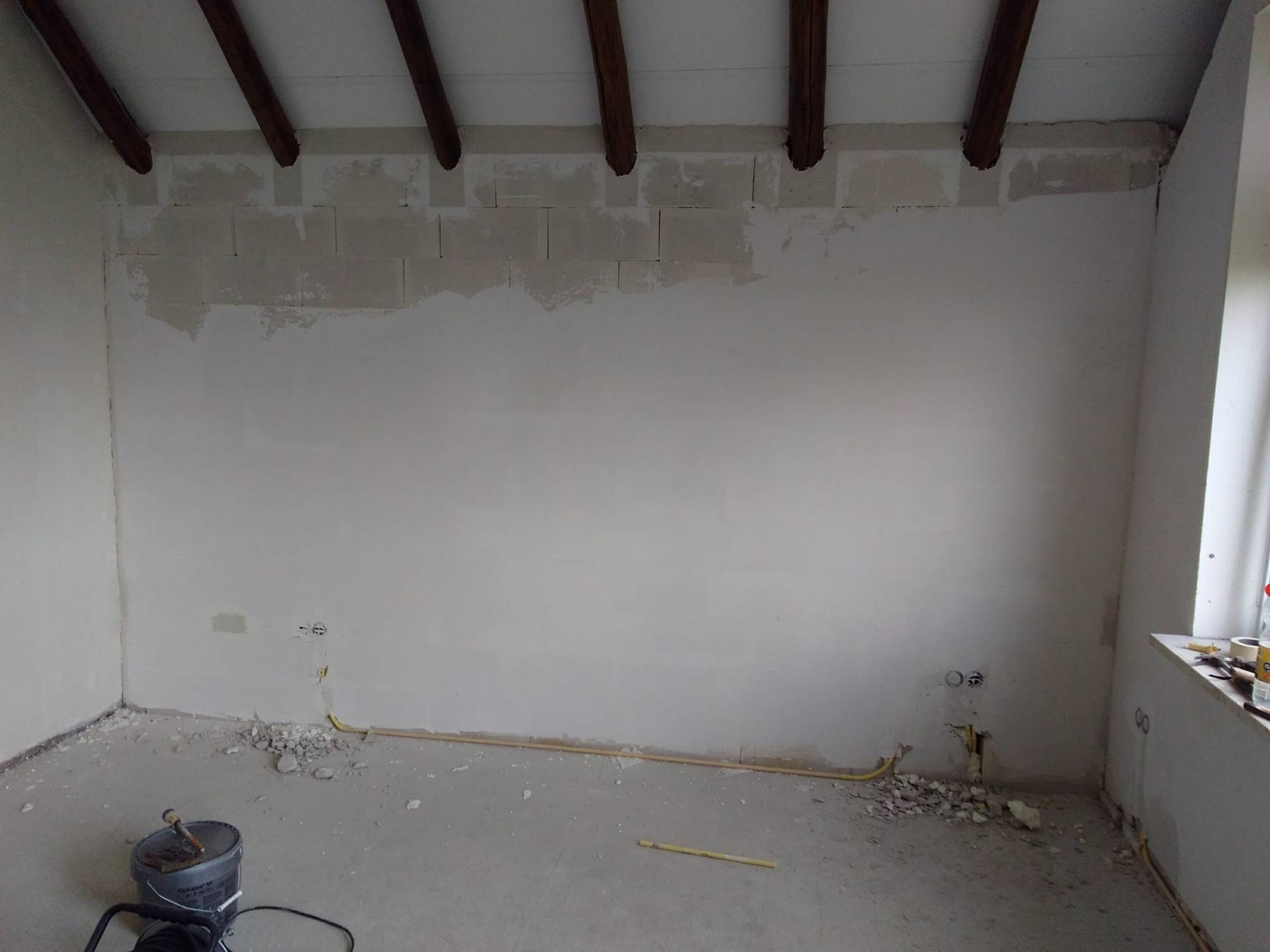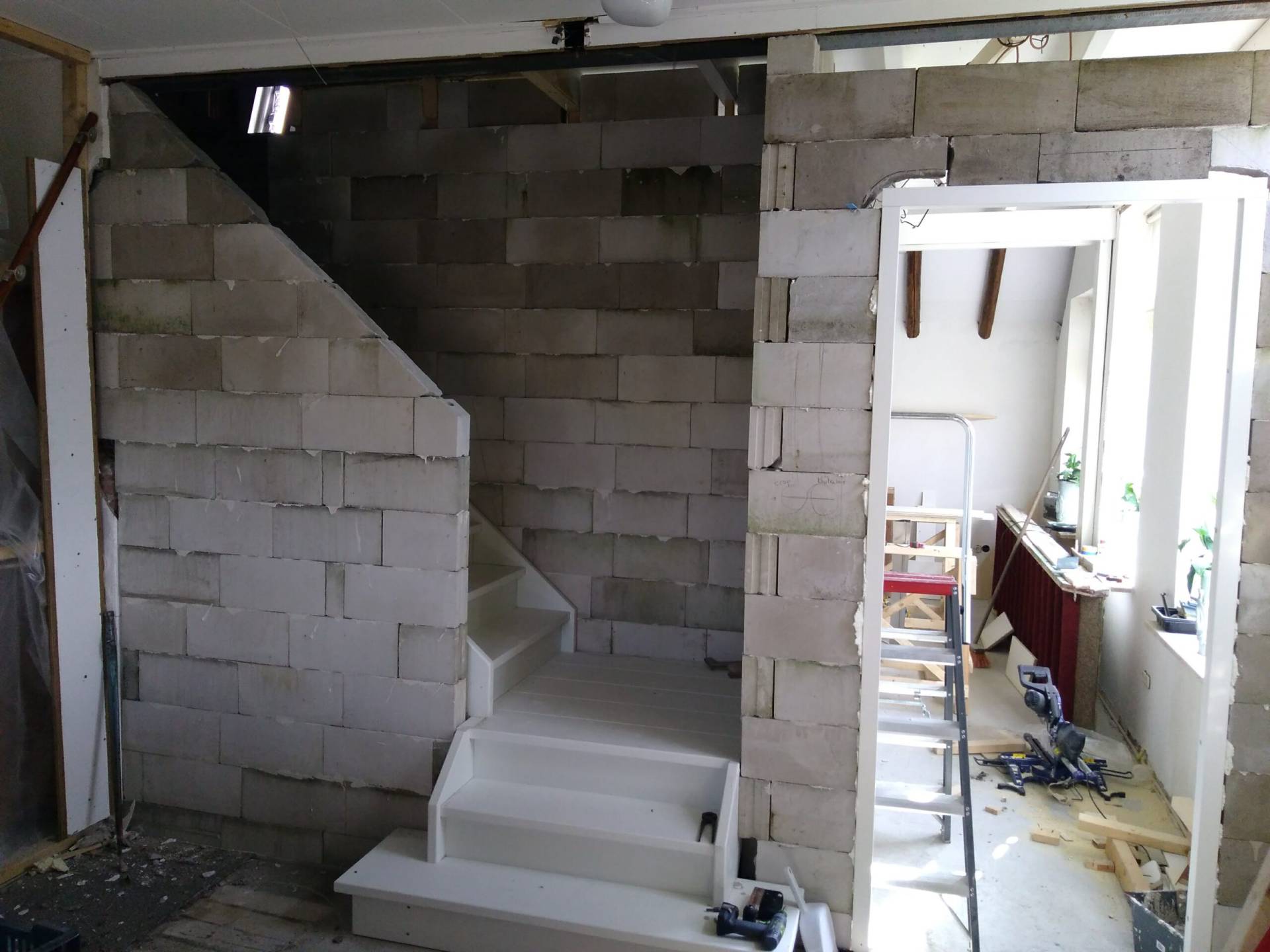 In 2018 gaan we verder met de voorkamer. De muren worden gestuct en tussen de voorkamer en de toekomstige hal wordt een nieuwe trap geplaatst.