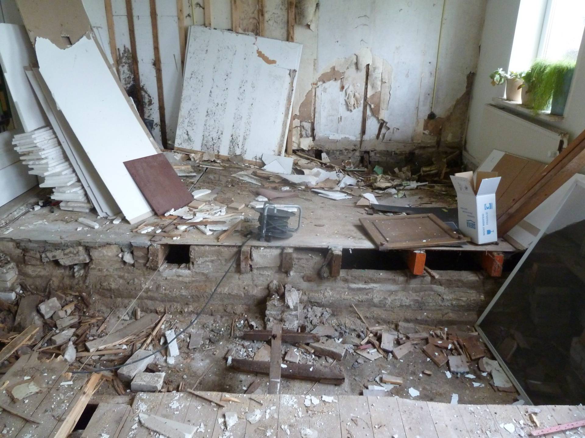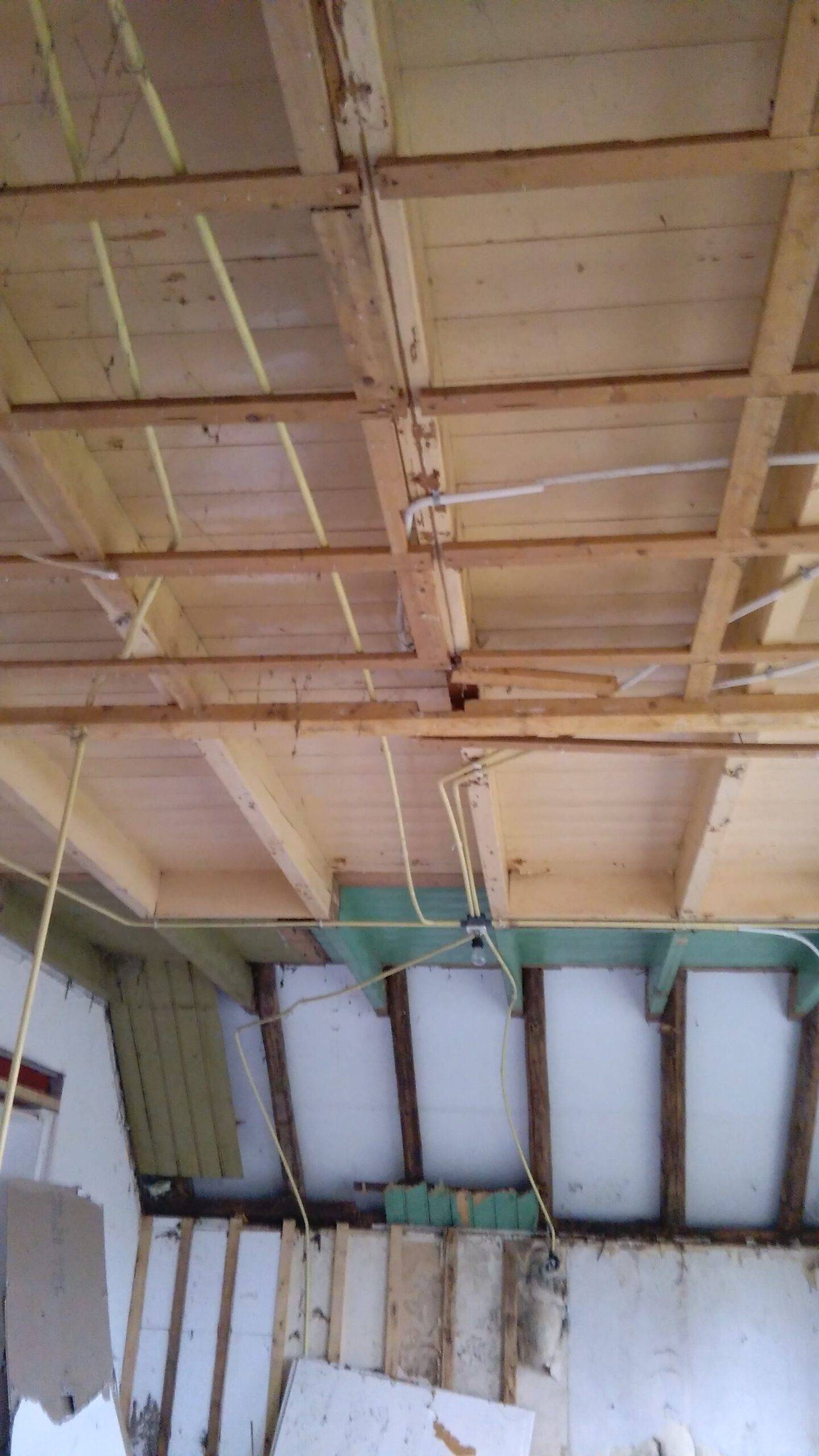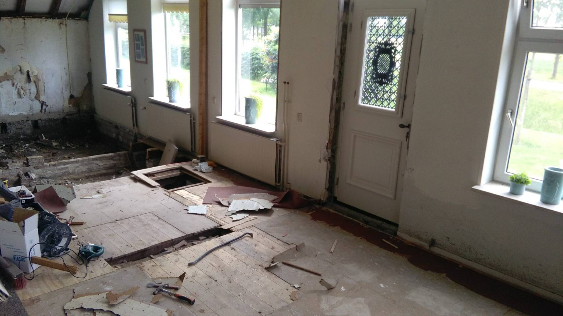 In de voorgevel is op de oorspronkelijke plek een nieuwe voordeur geplaatst en zijn we binnen verder gegaan met de woonkamer. De verrotte vloerbalken zijn verwijderd en achter de platen van het plafond zitten mooie balken. Die mogen weer in het zicht.