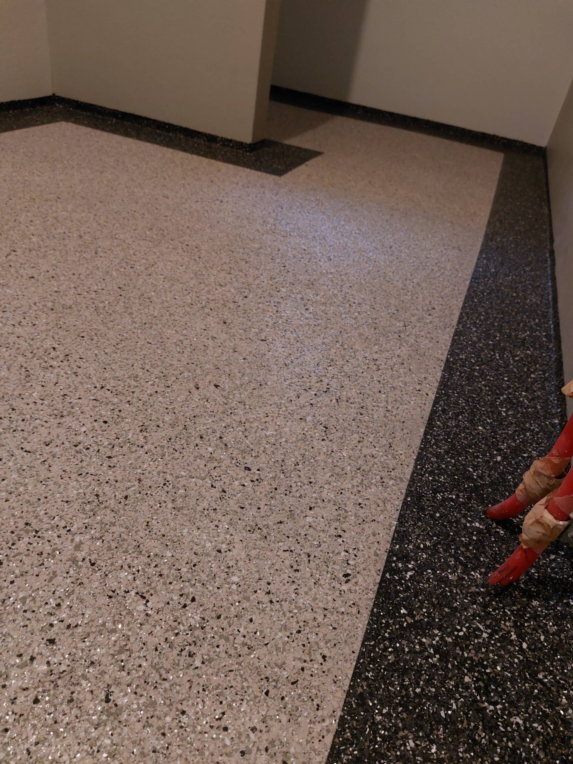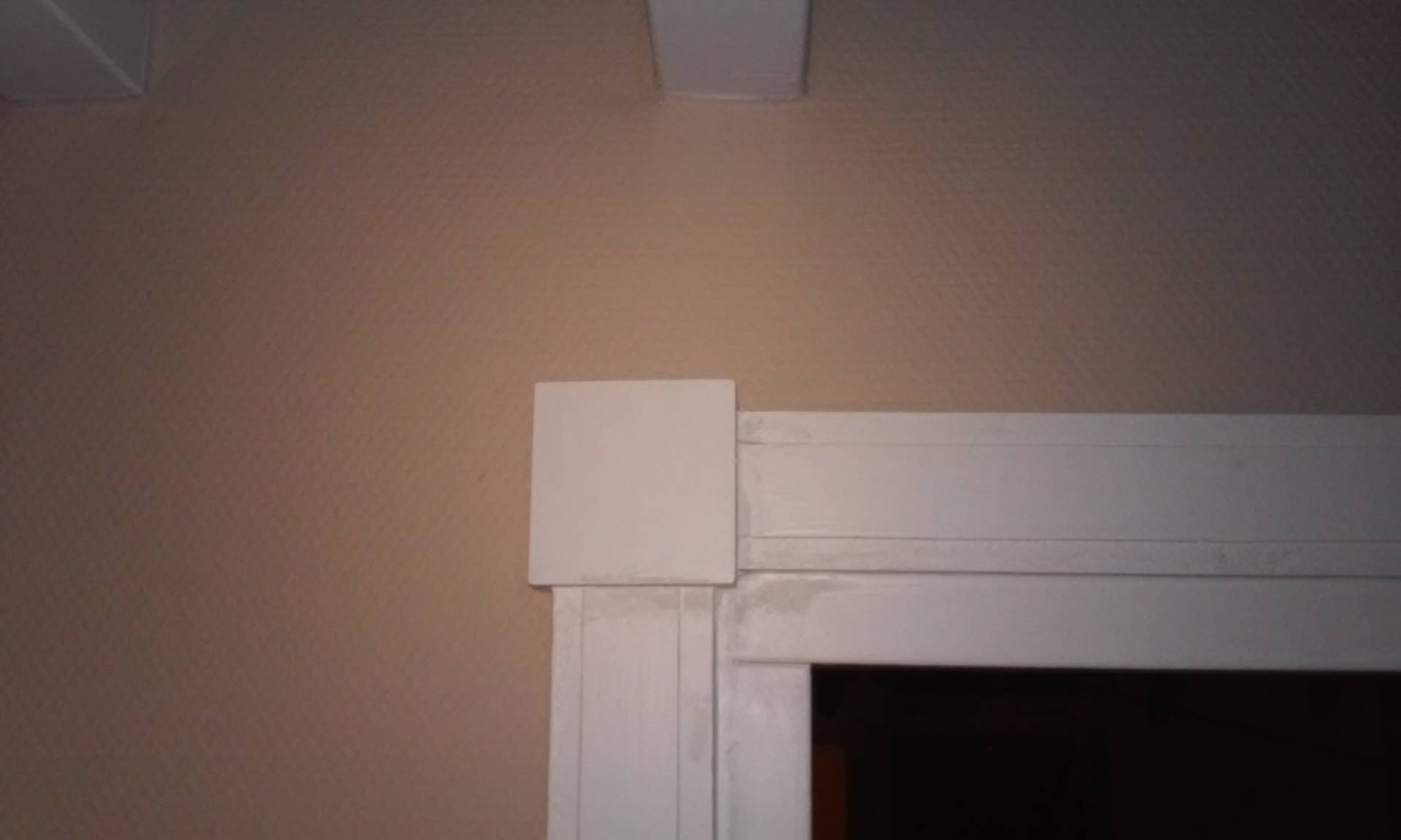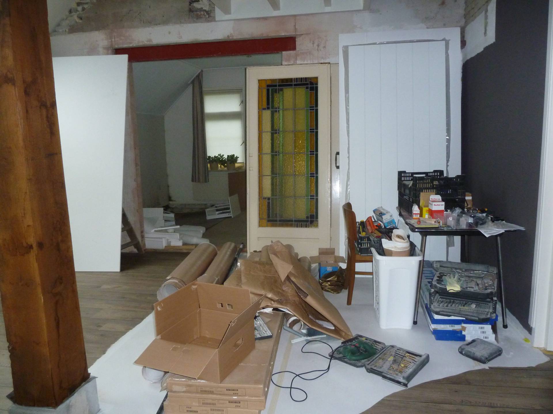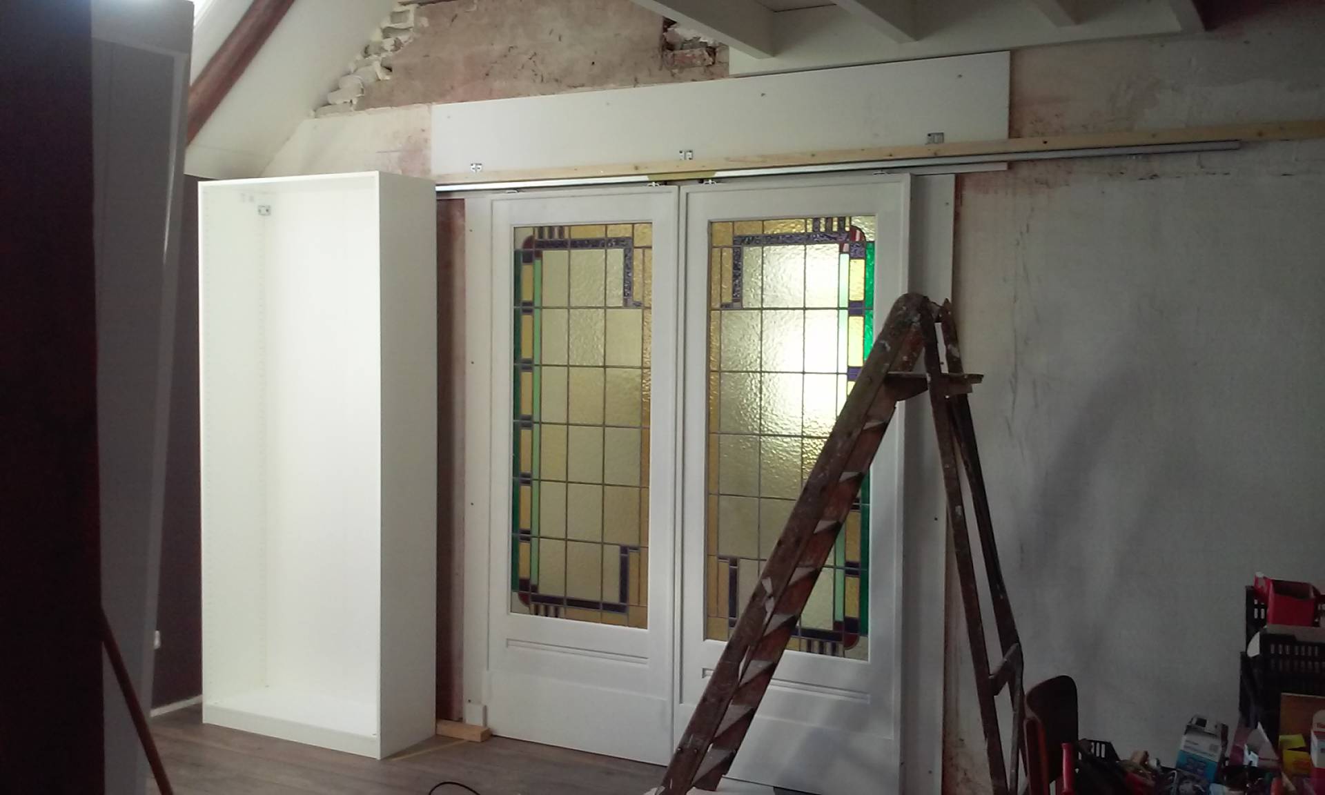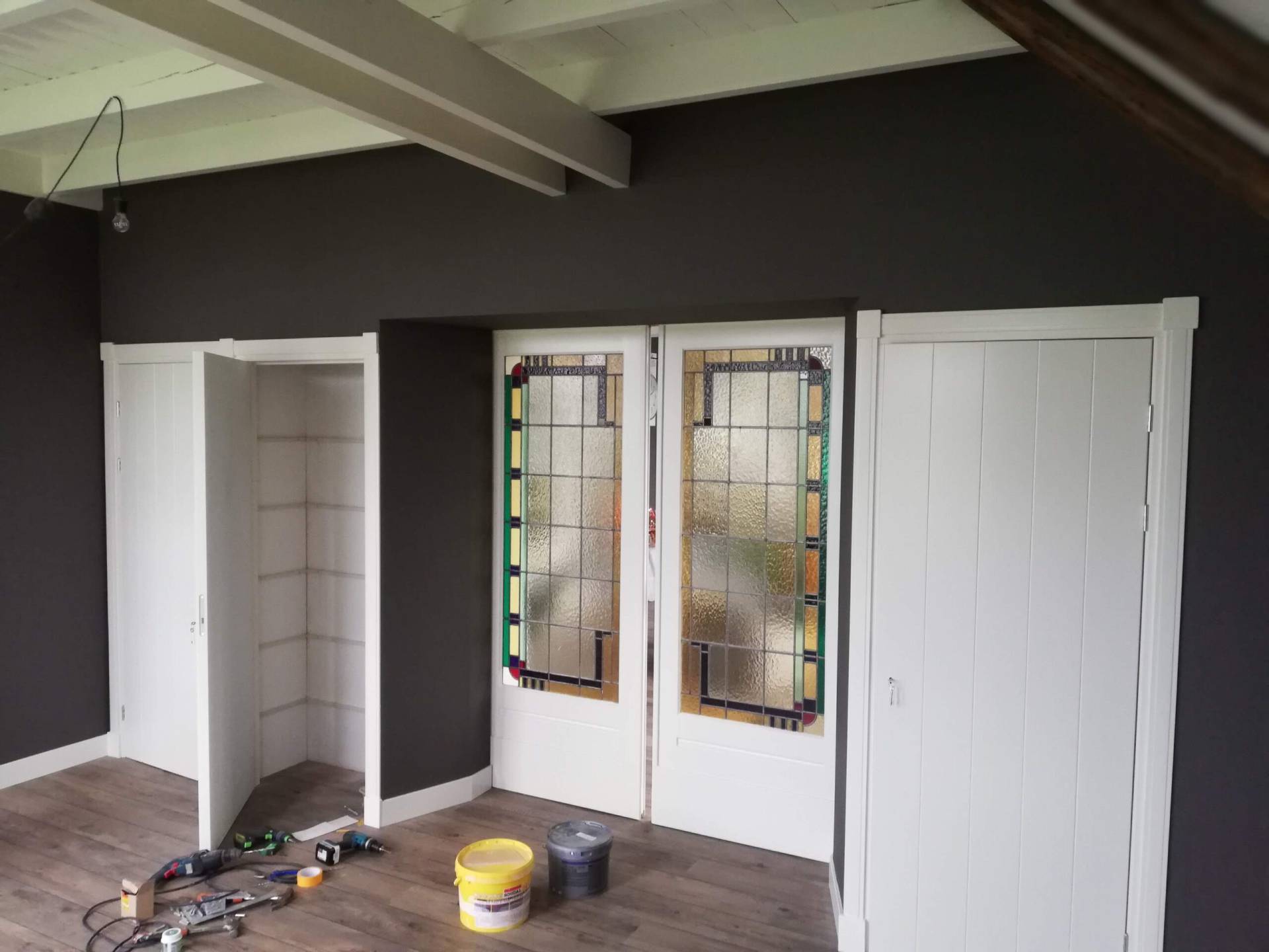 De doorgang voor de schuifdeuren is gemaakt. De koplatten bij de kozijnen zijn voorzien van profielen, neuten en sierhoekstukken. Helemaal jaren-30-stijl. Eerst nog de definitieve vloer van pvc erin.