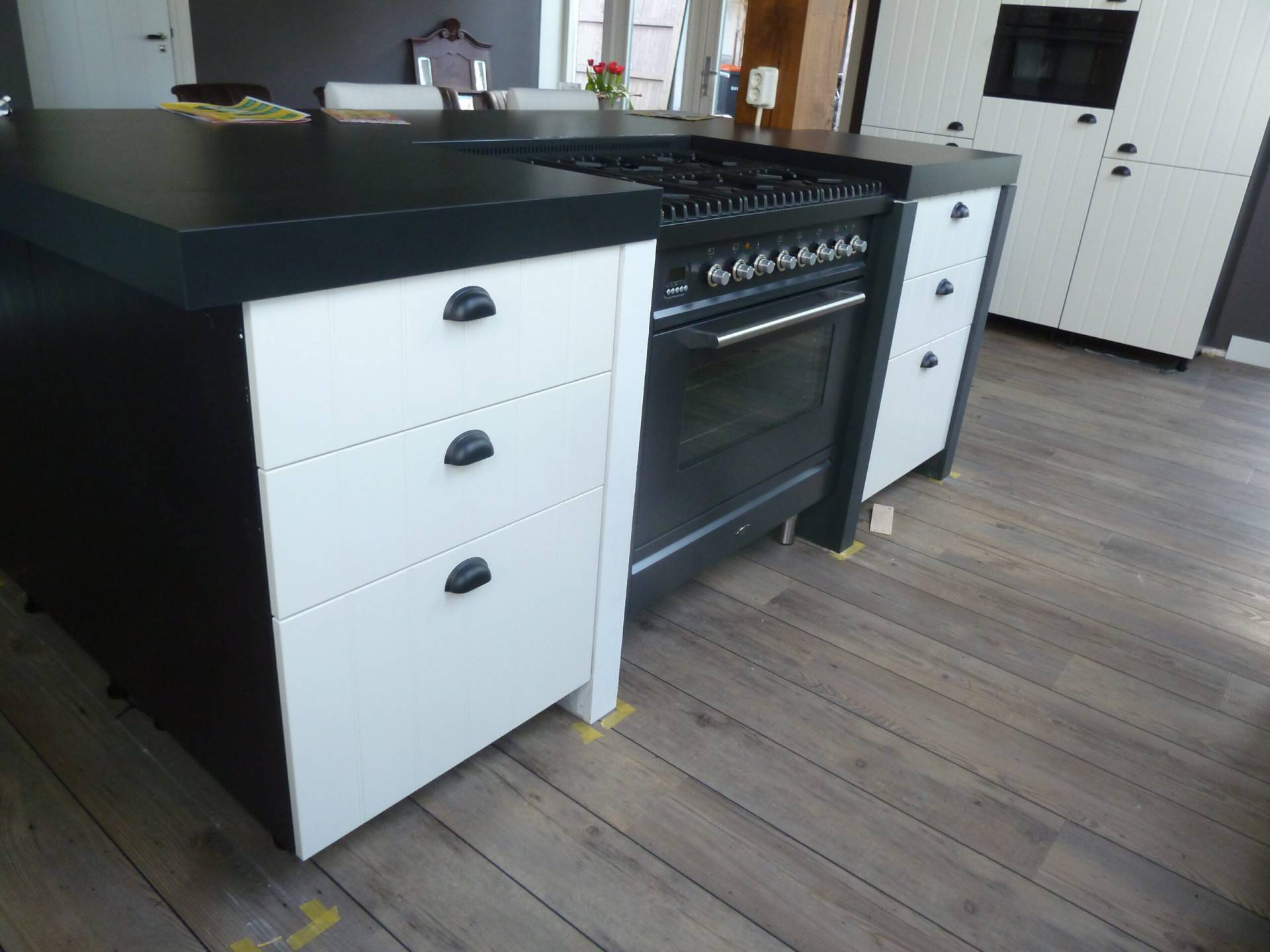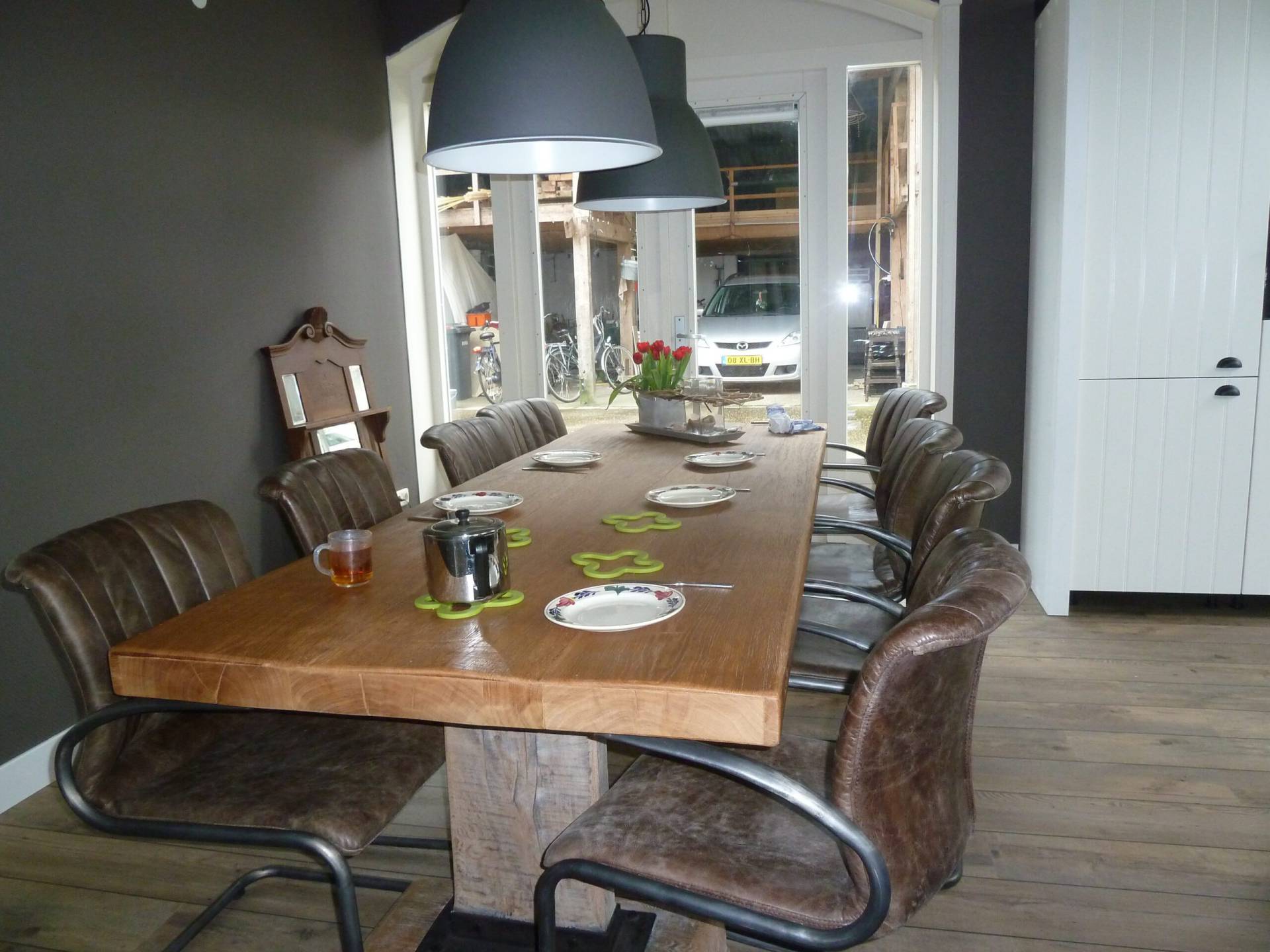 In het begin van 2016 worden de schuifdeuren, die we uit Zeeland hebben gehaald, op maat gemaakt en geplaatst. De muren zijn afgewerkt en in kleur gesaust en we plaatsen de keuken. Met de grote stamtafel op zijn plaats is het tijd om van de oude woonkamer en keuken naar de nieuw woonkeuken te verhuizen.