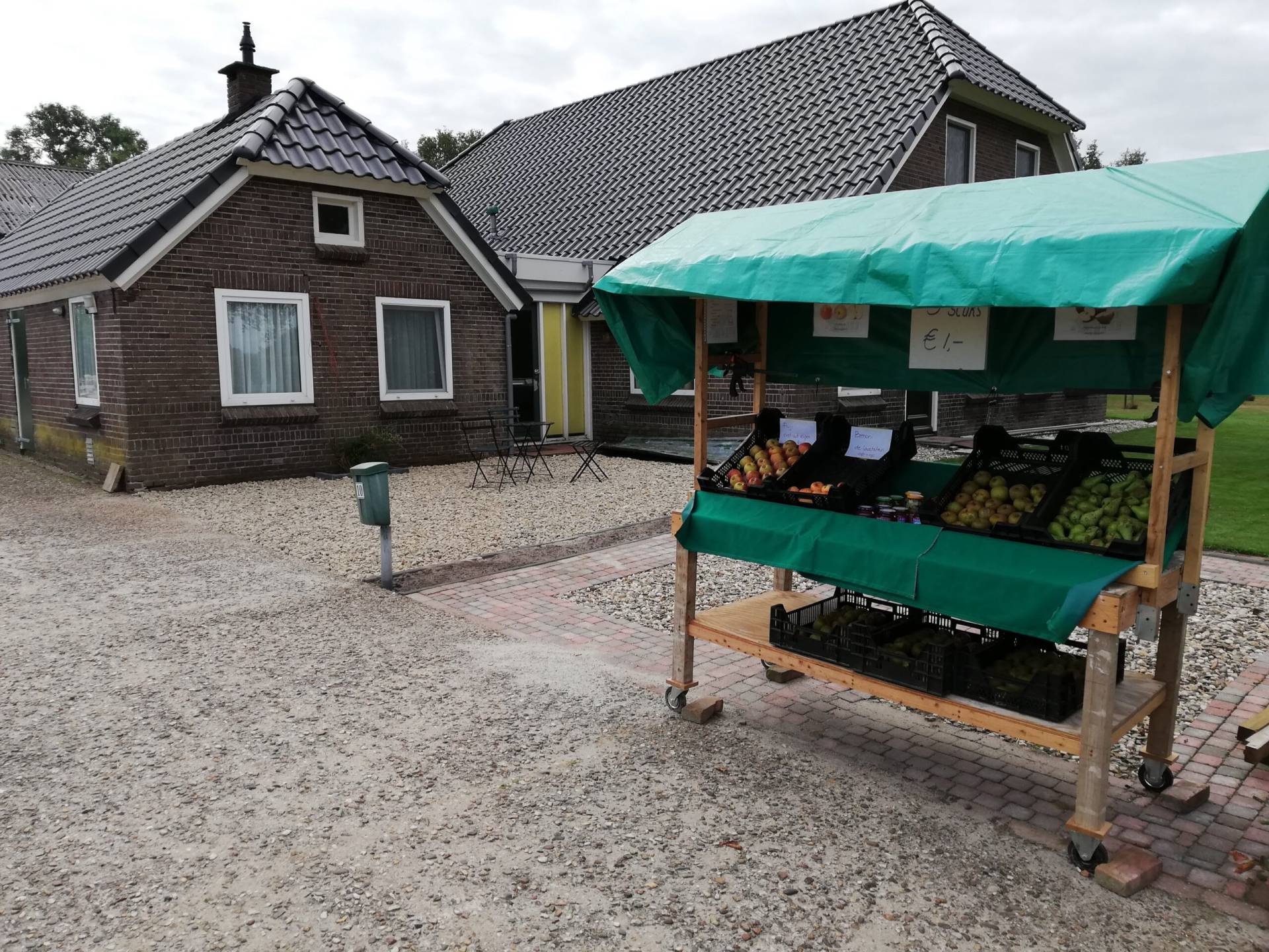 Omdat de oogst steeds groter wordt, hebben we een kraampje gemaakt waarmee we aan de weg wat kunnen verkopen. Binnen gaan we verder met de vloerverwarming en de afdekvloer. Ook hier komt pvc op.
